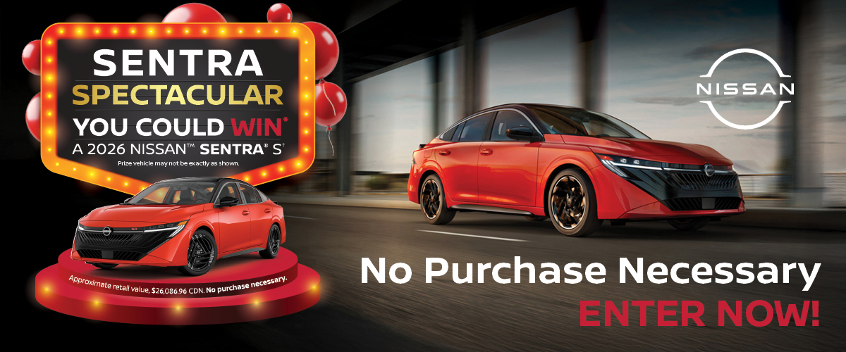*NO PURCHASE NECESSARY. Subject to Official Rules at https://sentra-spectacular.nissangiveaway.ca/official-rules, including a list of participating dealers and how to enter without visiting a participating dealer. The contest ends at 11:59:59 P.M. AST on December 31, 2025. Open to legal Canadian residents who reside in the provinces of Nova Scotia, New Brunswick, and Newfoundland and Labrador and are of the age of majority in their respective provinces at the time of entry. To enter, scan the QR code or enter the website domain found on any Contest advertisement and complete the entry form. One (1) Prize (the "Prize") available to be won consists of a 2026 NISSANTM Sentra® S vehicle in Energetic Ember with an approximate retail value of $26,086.96 CDN. The odds of winning depend on the total number of eligible entries received during the Contest Period. A random draw will be held on January 12, 2026. The selected entrant must correctly answer a mathematical skill-testing question and complete a Declaration and Release of Liability Form.